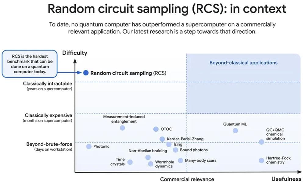 该领域的下一个挑战是展示当今量子芯片上第一个“有用的、超越经典”的计算,该计算与实际应用相关。谷歌团队乐观地认为Willow一代芯片可以帮助他们实现这一目标。迄今他们已经进行了两种不同类型的实验。一是运行RCS基准测试,衡量了与传统计算机的性能,但尚无实际的商业应用;二是对量子系统进行了科学上有趣的模拟,这推动了新的科学发现,但仍在传统计算机的范围内。