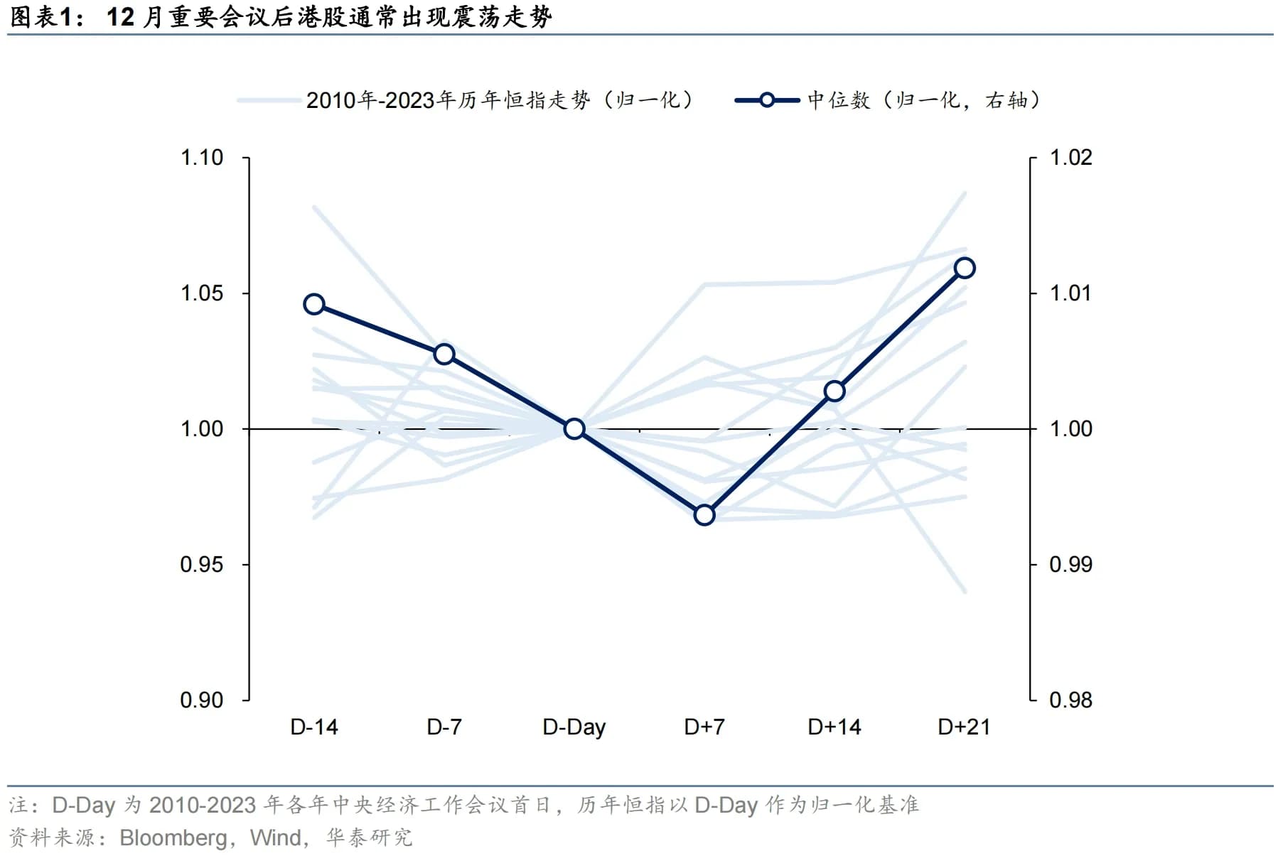 华泰证券指出,复盘2010至2023年,中央经济工作会议后恒指通常呈现震荡走势,会议首日后一周有一定机率出现阶段小调整、会议后第二周则转向上行且收盘水位略高于会议首日,会议首日后一周下跌与会议后第二周上涨14年中各自发生概率皆约64%。