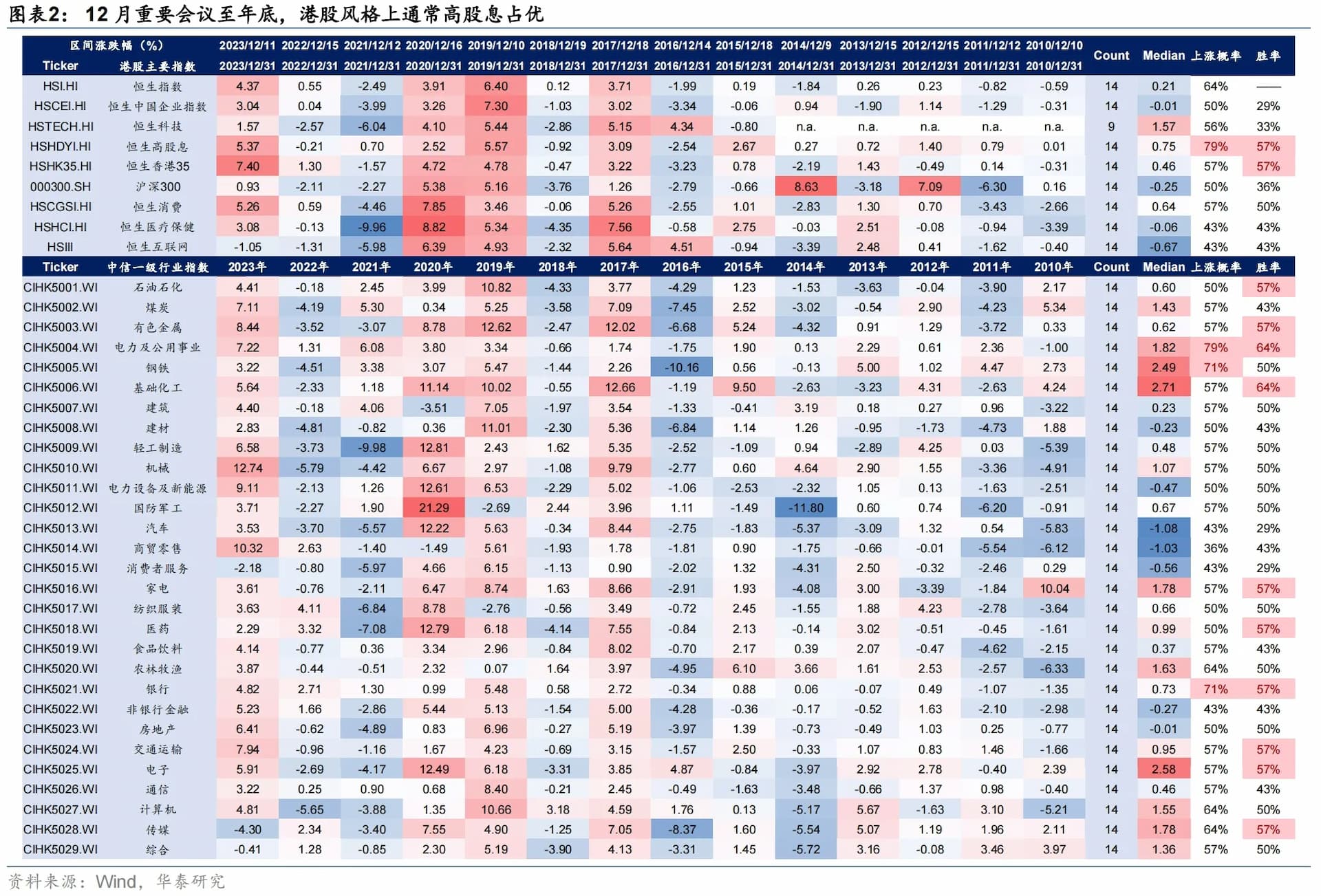 结构上,以各年中央经济工作会议首日至年底复盘,该阶段港股红利风格或相对占优(上涨概率高于70%且较恒指胜率超50%)、成长类风格如恒生科技胜率表现相对较弱;行业中,银行和电力及公用事业表现相对占优,与风格特征相匹配。