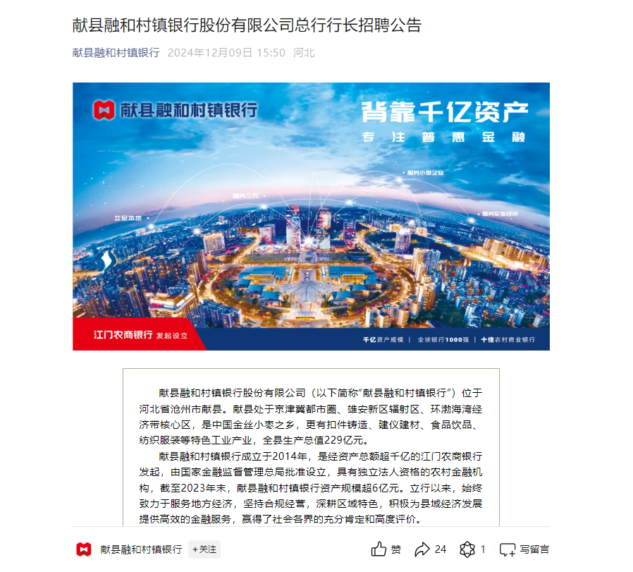 12月9日,献县融和村镇银行股份有限公司在官方微信公众号发文称,公开招聘总行行长,限定年龄45岁以下。今日,财联社记者查询发现,类似此类市场化招聘的现象,近两年来已经有多起。另外,从公开信息来看,这也是献县融和村镇银行年内“二度挂榜”。