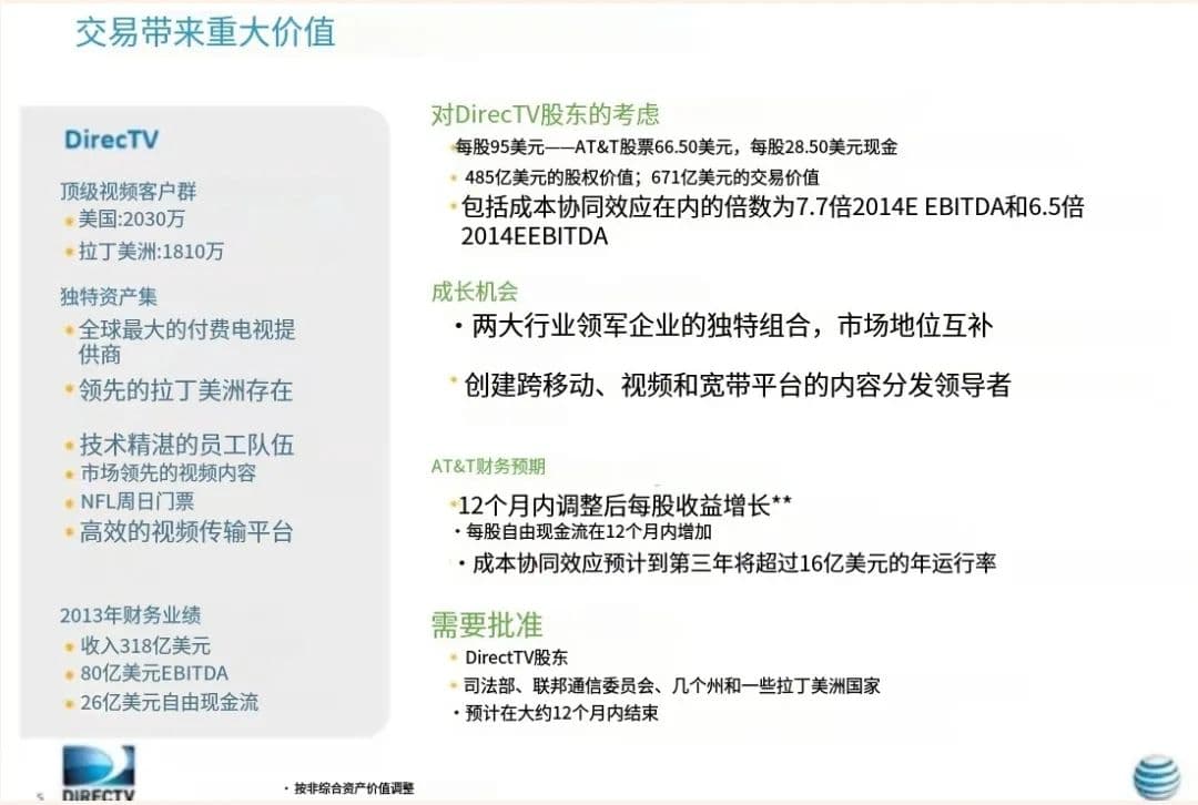AT&T的现任CEO斯坦基,2014 年是 AT&T 娱乐集团的负责人,也是DirectTV交易签署时的战略负责人。他当时是这样谈论这笔交易的: