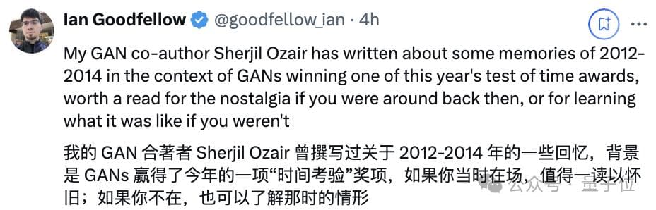 非常高兴听到GAN(生成对抗网络)在2024年NeurIPS大会上获得时间检验奖。