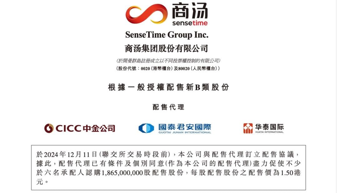 公司情报专家《财经涂鸦》获悉,12月11日,商汤(0020.HK)发布公告(《根据一般授权配售新B类股份》)称,公司与配售代理签订协议,通过不少于6位乘配人以1.5港元配售1,865,000,000股。