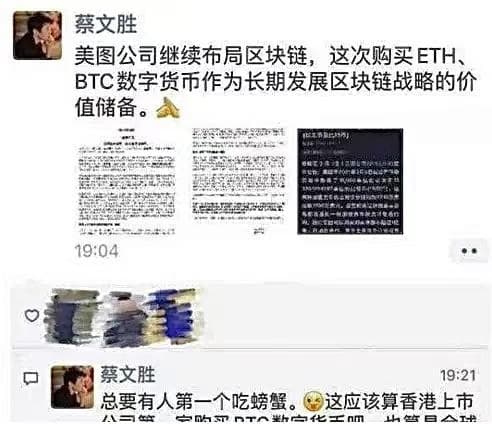 彼时,蔡文胜还在朋友圈高调发文称:“总要有人第一个吃螃蟹。这应该算香港上市公司中第一家购买BTC数字货币的吧,也算是全球第一家上市公司把ETH以太坊作为货币价值储备。”