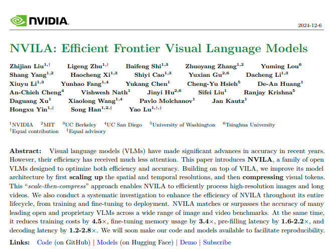 优化准确性与效率:NVILA模型在训练成本上降低了4.5倍,微调所需内存减少了3.4倍。在预填充和解码的延迟上几乎降低了2倍(这些数据是与另一个大型视觉模型LLaVa OneVision进行比较得出的)。