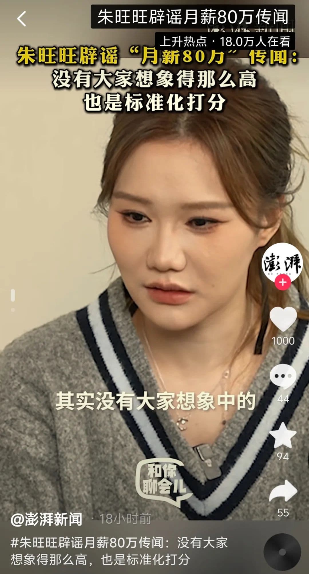 朱旺旺表示:“我可以辟谣,没有大家想象得那么高。因为客观来说,我还是公司的员工,所以就是正常的薪资再加绩效,我们会有一个很标准化的打分。工资有的时候会被妖魔化,会有一点夸张。”