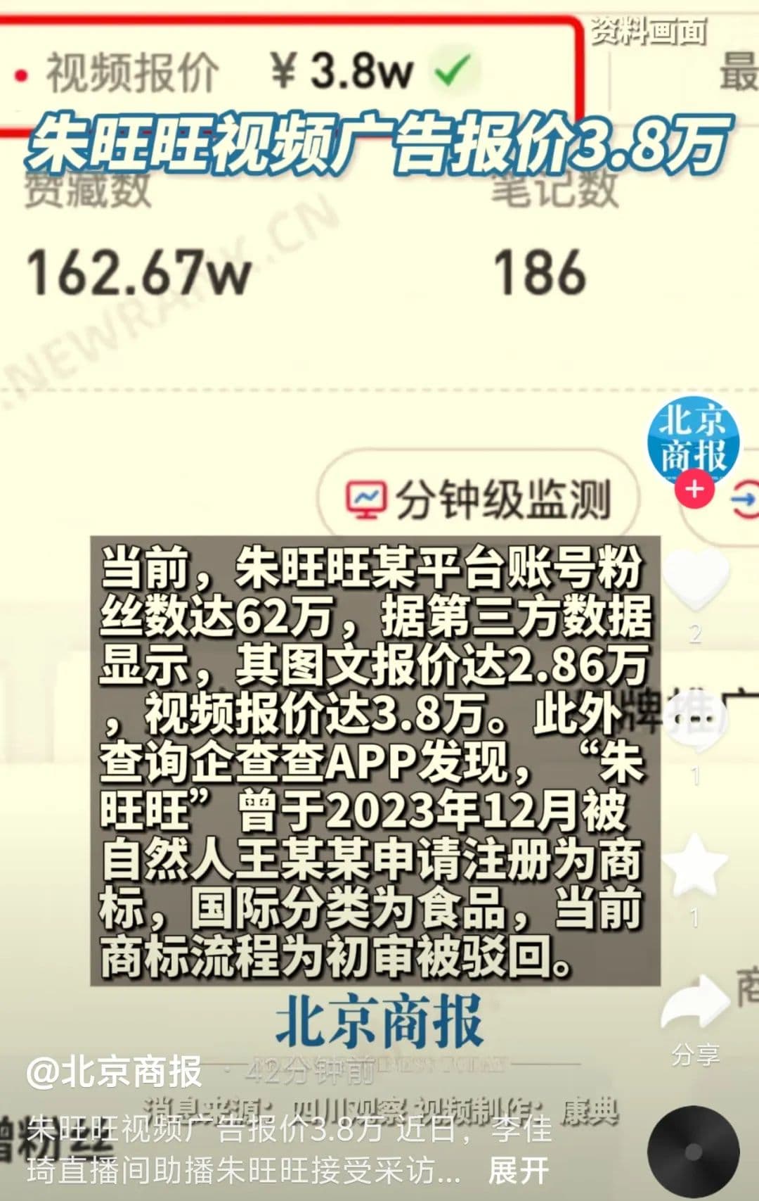 据了解,朱旺旺也在运营自媒体账号。她目前在某平台账号粉丝量已经达到了62万。第三方数据显示,其图文报价达2.86万,视频报价达3.8万。