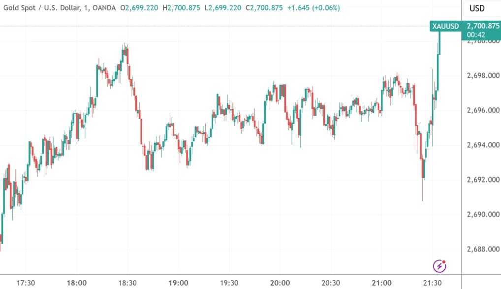 截至发稿,道琼斯指数期货(2412合约)涨0.10%,标普500指数期货涨0.25%,纳斯达克100指数期货涨0.44%。现货黄金震荡走高,上冲2700美元/盎司。