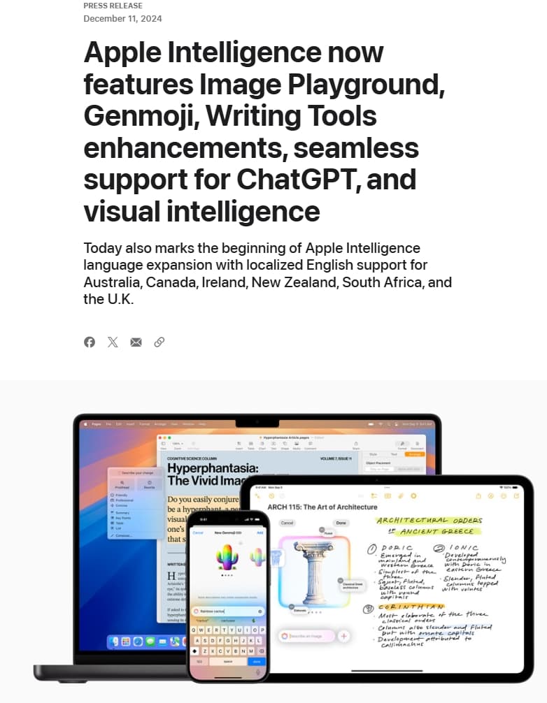 就在发稿前,苹果确认会在周三推送iPhone、iPad和Mac的系统更新,这也是“苹果智能”发布至今最重要的一次大版本更新,其中ChatGPT在iOS 18.2里与Siri集成。当然,这个功能依然只提供给英语用户,支持范围从美国扩展至英国、澳大利亚、新西兰等地的本地英语。