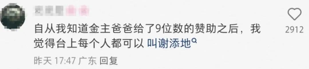 就在谢添地引爆舆情讨论之时,一则有关冠名费高达九位数的网传消息也旋即流传开来,有网友感概“完全不知道的牌子突然被大众熟悉,几位数都划算啊”。
