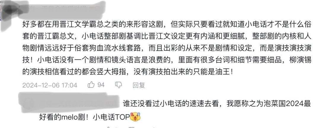 饰演《现在拨打的电话》的男主的柳演锡,曾获SBS演技大赏荣誉,以及青龙奖、百想艺术大赏和大钟奖多项提名,被称为“演技派下沉来演偶像剧”。在该剧中,他的演技成为了吸粉的重要利器,被评价为“真把小说里的形容词都演出来了!”“凭入木三分的演技把玛丽苏文男主演出了灵魂”。