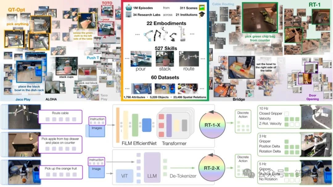 Open X-Embodiment包含两项成果,其一是一个机器人学习数据集,其二是基于该数据集训练的机器人运动控制模型RT-X。