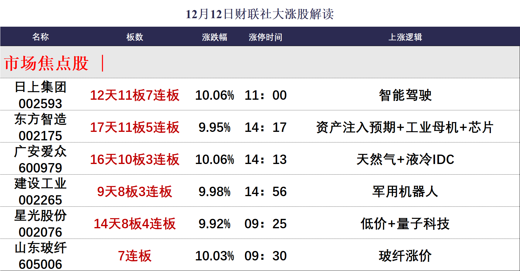 财联社12月12日讯,今日139股涨停,39股炸板,封板率为78%,山东玻纤7连板,日上集团12天11板,东方智造17天11板,广安爱众16天10板,建设工业9天8板,宜宾纸业、天域生物5连板,惠发食品、帅丰电器、星光股份4连板,广安爱众16天10板,巨轮智能、五洲新春10天7板,中百集团9天6板,三维通信13天6板,金财互联、华远地产、文峰股份、卓郎智能6天5板,视觉中国8天5板,永辉超市10天5板。沪深两市全天成交额1.87万亿,较上个交易日放量905亿。盘面上大消费股成为市场最强主线,其余热点则大多数冲高回落,全市场超3500只个股上涨,逾150股涨停或涨超10%。板块方面,零售、冰雪产业、食品加工、保险等板块涨幅居前,人形机器人、Sora概念、光刻机、钢铁等板块跌幅居前。截至收盘,沪指涨0.85%,深成指涨1%,创业板指涨1.35%。