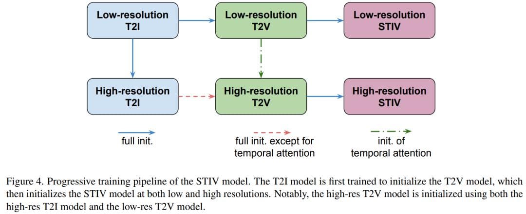 我们采用渐进式训练策略,其流程如图 4 所示。首先训练一个文本到图像(T2I)模型,用以初始化文本到视频(T2V)模型;随后,T2V 模型用于初始化 STIV 模型。为快速适应高分辨率和长时训练,我们在空间和时间维度中加入了插值的 RoPE 嵌入,并利用低分辨率、短时长模型的权重进行初始化。值得注意的是,高分辨率 T2V 模型同时结合了高分辨率 T2I 模型和低分辨率 T2V 模型的权重进行初始化。