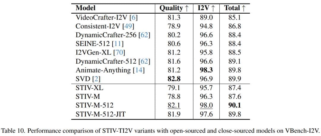 如表中所示,我们的模型在与最新方法的对比中表现出色。分析表明,尽管模型参数扩展提升了 I2V 分数,但对质量的影响较小。相比之下,提高分辨率能够显著改善质量和 I2V 分数。这一趋势表明,分辨率的提高对于提升多任务生成能力尤为关键。完整的分解维度结果见文章附录。