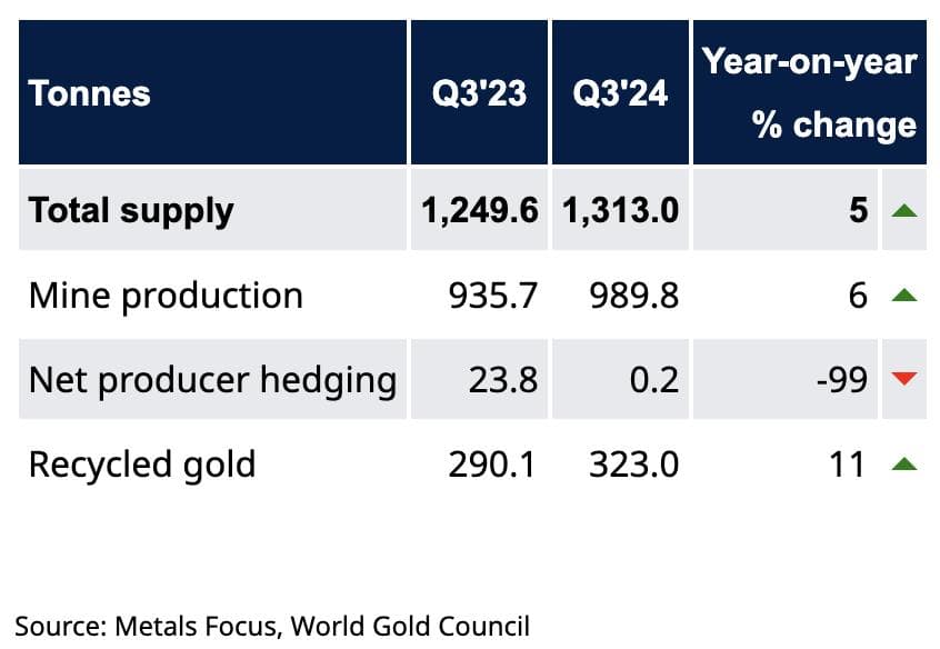 首先供给端,据世界黄金协会数据,今年第三季度黄金总供应量同比增长高达5%,其中最主要的来源——金矿产量创造了历史季度新高的990吨,同比增长6%。