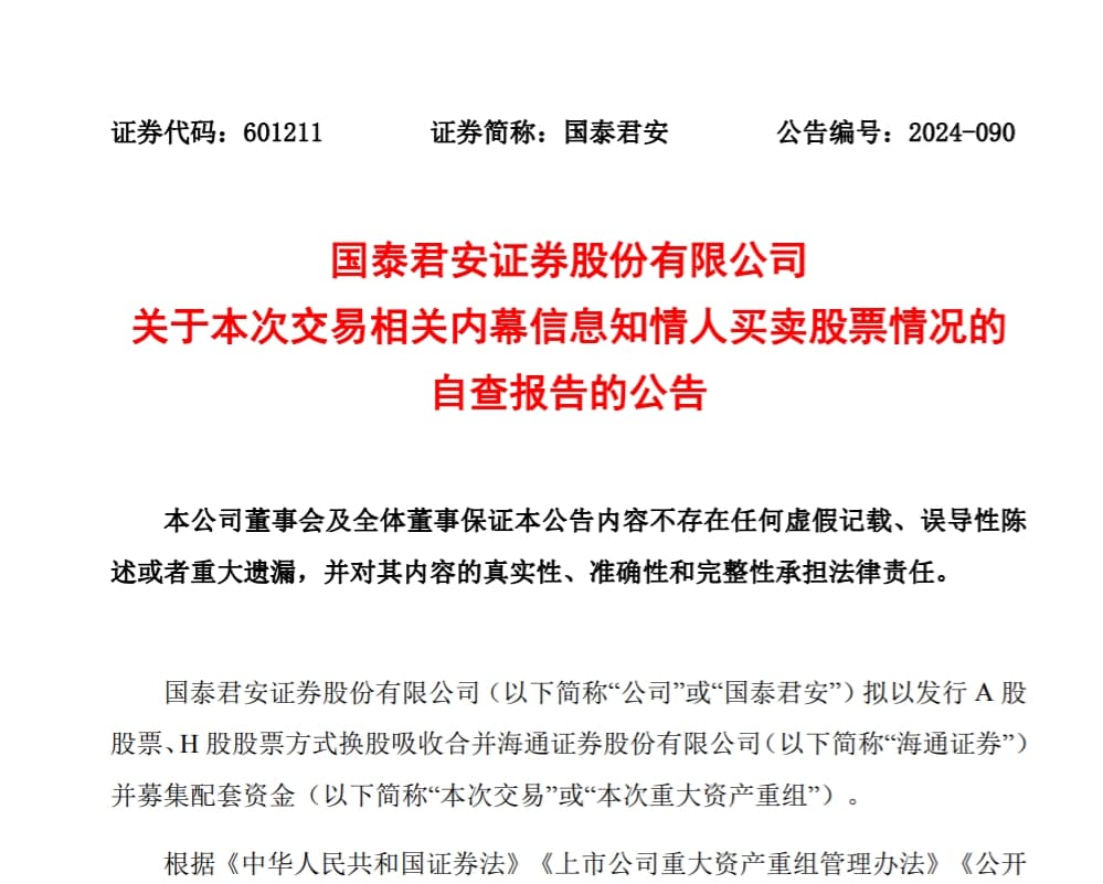 公告显示,本次交易的内幕信息知情人买卖股票情况的自查期间为国泰君安、海通证券首次披露本次交易事项或就本次交易申请股票停牌(孰早)前六个月至《国泰君安证券股份有限公司换股吸收合并海通证券股份有限公司并募集配套资金暨关联交易报告书(草案)》首次披露之前一日止,即自2024年3月5日起至2024年11月21日期间。
