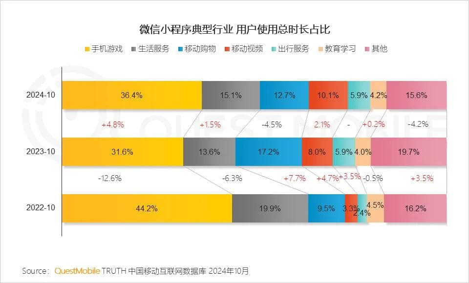 报告显示,在一众应用类型中,“手机游戏”是抢占用户时长最高的赛道,其占比达到36.4%,远超“生活服务”、“移动购物”等生活出行方面的小程序,且同比增长4.8%。