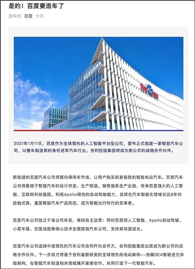 在那个小米刚刚宣布造车、赛力斯与华为还在摸索合作模式的时候,深耕智驾的百度与刚刚推出浩瀚平台的吉利联姻,可谓是强强联手,一时风头无二,兴奋的百度直接向大家宣布造车。