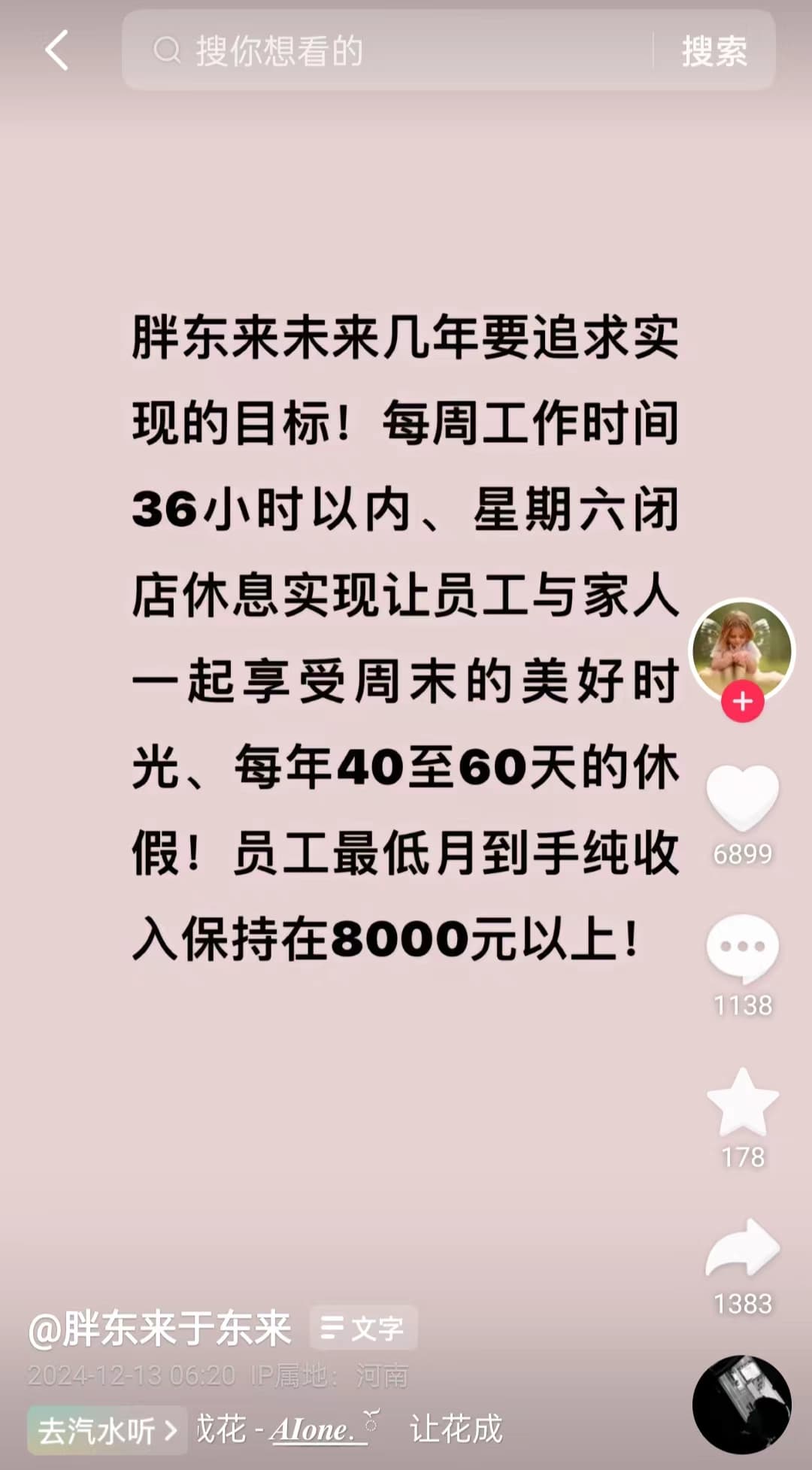 财联社12月13日讯,今日,于东来在抖音平台发布七条作品,探讨经营理念以及未来规划。