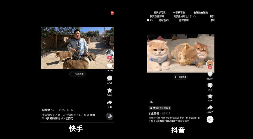 这个现象很有意思,想起5年前我在快手的时候,发现在宠物这个品类,短视频平台呈现“快手狗”和“抖音猫”的趋势,意思是各自在宠物品种上有自己的优势。