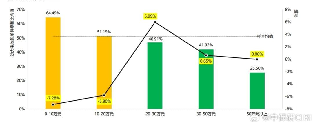 10月份中保研发布了第 18 期汽车零整比体系指标研究成果,其中采样了59款市面常见的纯电车型,得出的电池包平均零整比是50.96%,用大白话来说,行业平均水平为,你换个电池包,等于重新买半台新车。在各个价格段中,10万以下的平价车型电池零整比最高,达到了惊人的64.49%。