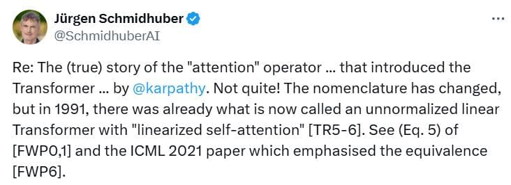 不过,LSTM作者Jürgen Schmidhuber却不认可这段故事,而是表明自己才是真正的创造者,1991年就已经提出线性复杂度Transformer,并且在两年后提出术语「注意力」,他在2023年12月还发表过一篇报告,控诉图灵奖三巨头抄袭自己的研究成果。