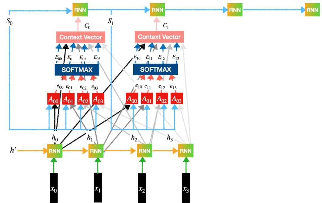某一天,Dzmitry受到了英语翻译练习中的启发,人类在翻译时,目光会在源序列和目标序列之间来回移动,将软搜索表示为softmax,然后对BiRNN状态进行加权平均,就能让Decorder RNN学会在源序列中搜索放置光标的位置。