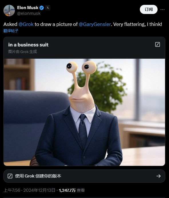 在另一篇帖子中,马斯克贴出了其让聊天机器人Grok生成的根斯勒画像,意在嘲讽根斯勒的外表长相,并写道“我觉得这很讨人喜欢!”