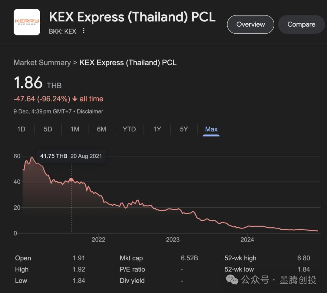 从体量来说,极兔和SPX Express已经把其他玩家远远甩在了后面。而也可以看得出市场上竞争最惨烈的其实可能不是大家都认为的东南亚电商第一大市场印尼,而是第二大市场泰国。头部五家中就有两家最主要的业务 - Flash和泰国邮政 - 在泰国市场。更不用说顺丰收购的嘉里物流旗下以泰国业务为主的快递公司Kerry Express在上市之后股价从62铢跌到1.86铢(截至发稿日)的惨烈表现了: