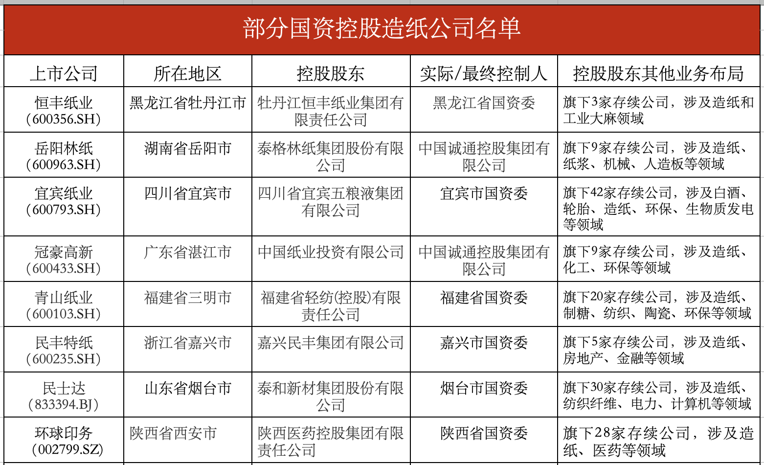 资料显示,按东财行业分类,整个A股市场共有造纸印刷类上市公司近60家,其中约9家为国资控股纸企,除前述已公告收购计划的3家公司外,冠豪高新(600433.SH)、青山纸业(600103.SH)、民丰特纸(600235.SH)、民士达(833394.BJ)等后续是否会有类似资本运作也受到市场关注。