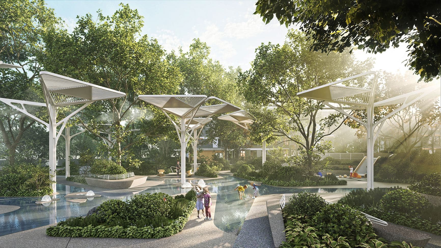再往里进入社区中心,约3.8万平米森系主题园林分为了“三大组团、四维体验”。