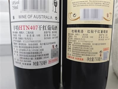“辛特HTN407”干红葡萄酒正面标签同样无中文字样,背面标签标注的产品配料、包装商及运营商信息、生产许可证编号、执行标准等与“杜瑞美洛·红钻干红葡萄酒”一致,主要区别在于进口来源地改为了“原酒产国:澳大利亚”,以及“澳大利亚原酒进口”相关提示。