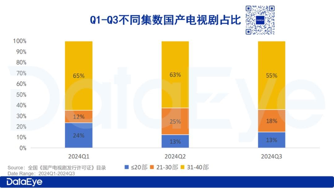 从今年广电总局的电视剧发行许可证数据来看,30集以下的国产电视剧占比正在增多,30集-40集的国产电视剧占比从Q1的65%下降到Q3的55%。