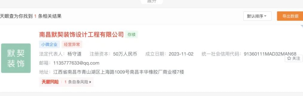 作者注意到,“默契家装”装修公司的全称为“南昌默契装饰设计工程有限公司”,成立于2023年11月,目前已显示为“经营异常”。