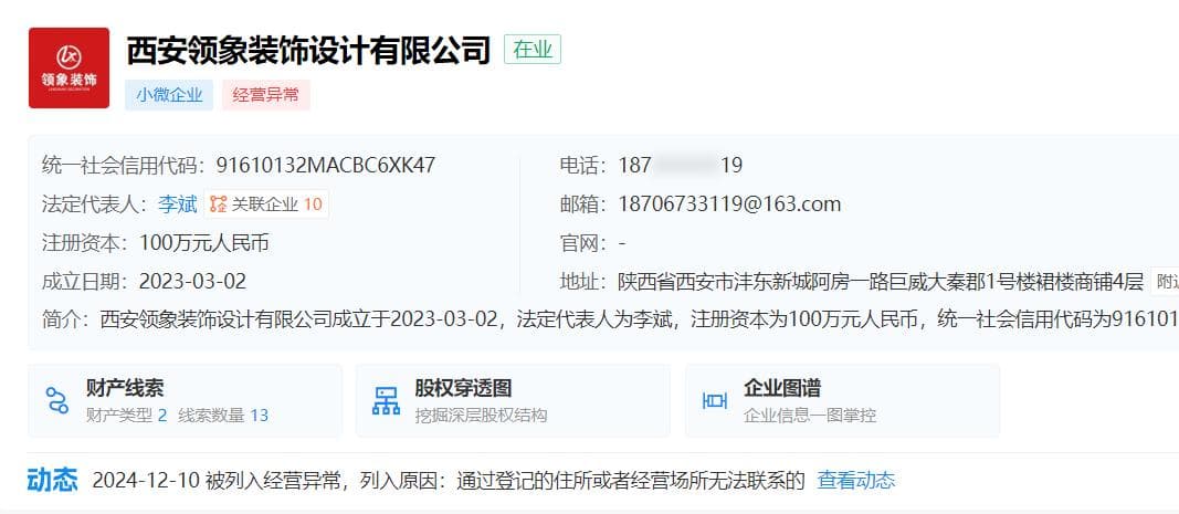 网上信息显示,西安领象装饰公司成立于2023年3月,注册资本一百万元,法人姓李,公司的经营范围大致包揽了和装修相关的多个领域。而目前领象公司设在西安咸阳两地的总共五家公司门店全部停业,负责人的电话也处于无法接通的状态。业主们目前已经在相互统计,准备前往辖区派出所报案,希望通过法律途径来解决此事。