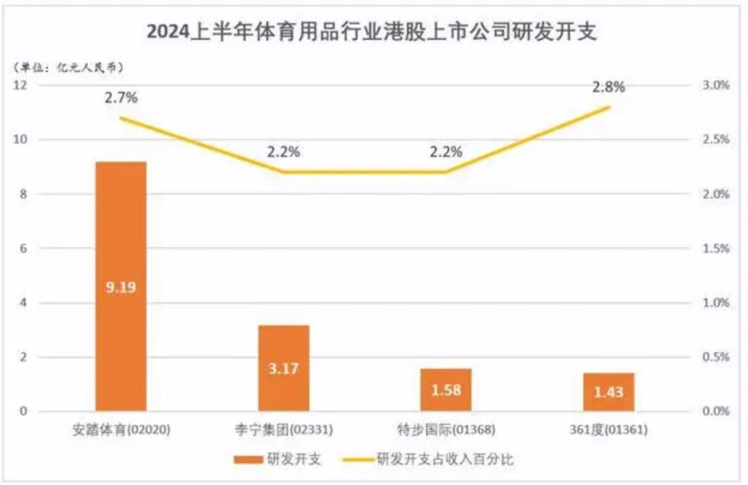 产品力未跟得上价格,根源或在于研发力度不强。2024年上半年,李宁研发费用为3.16亿元,研发费用占总营收的比例仅为2.2%,这一比例不仅远低于阿迪、耐克这样的巨头,老对手安踏超过9亿元的研发费用几乎是李宁的3倍,且研发占比也低于安踏的2.7%,特步的研发占比也有2.4%,361度的研发占比为2.8%。
