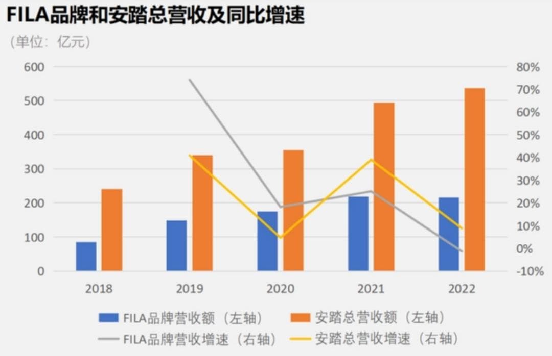 根据安踏体育的财报,2019年至2022年,FILA的营收增速分别为73.9%,18.1%和25.1%。2019年,斐乐营收突破百亿,两年后就直接突破200亿大关,2021年营收218.2亿元。此时李宁2021年营收不过是225.72亿元,安踏旗下一个品牌就已经可以抗衡李宁。十二年来,一直被安踏压在身下的李宁也没有安踏旗下斐乐这样拿得出手的品牌。
