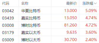 此外受益于比特币走强,相关加密货币ETF出现上涨。截至收盘,华夏比特币(03042.HK)、嘉实比特币(03439.HK)、博时比特币(03008.HK)分别上涨5.09%、4.74%、4.72%。