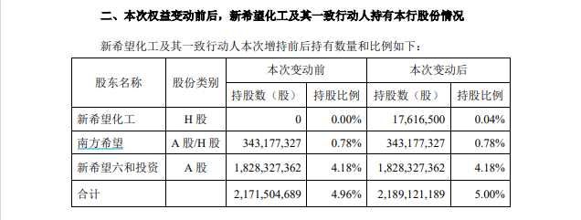 增持后,新希望化工及其一致行动人合计持有民生银行2,189,121,189股,持股比例由4.96%增加至5.00%。