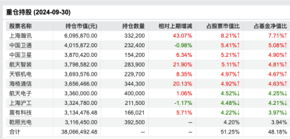 “尽管今年板块有所波折,但我们仍然看好卫星互联网的投资机会。”该产品基金经理张璐此前在季报中提到,2024年是中国商业航天的批量组网发射元年,我国卫星互联网行业有望迎来突破,产业将步入规模化发展阶段,重点企业业绩有望逐步兑现。