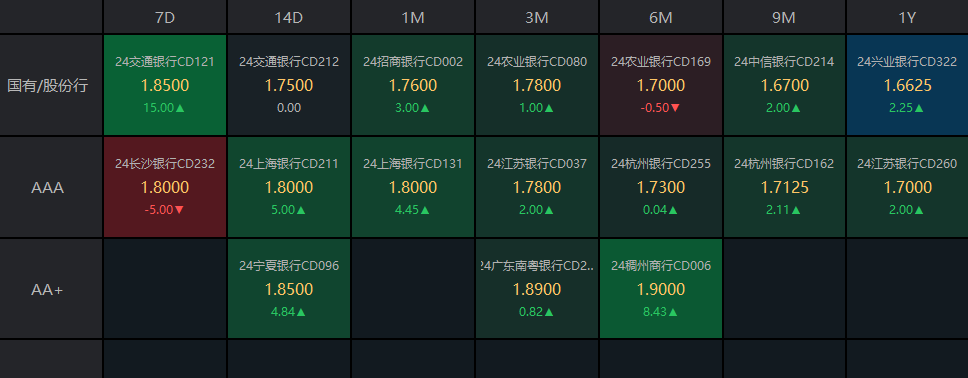 存单方面,今日3M期国股在1.7%-1.8%位置需求较好,较前一日上行1bp,1Y期国股报在1.64%-1.72%的位置,较前一日上行2.25bp。AAA级存单方面,9M成交在1.7125%,1Y成交在1.7%的位置。