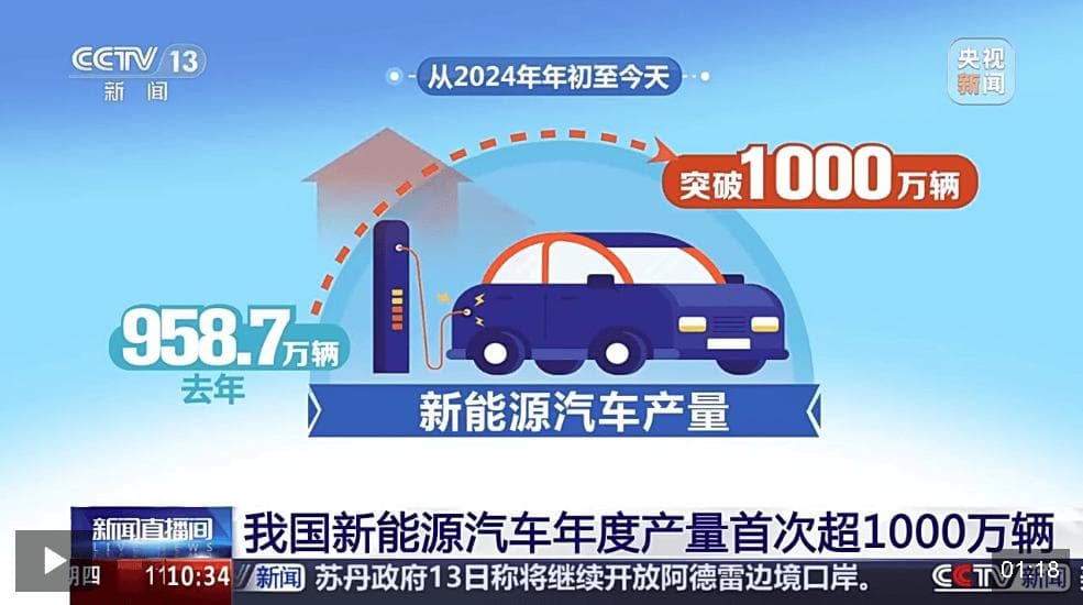 据央视新闻报道,11月14日上午,我国新能源汽车年产量首次突破了1000万辆,同时也是全球首个新能源汽车年度达产1000万辆的国家。