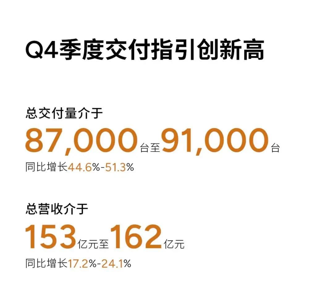 理想官方还给出了第四季度的指引,其中季度交付量预计达到16万-17万辆,同比增长21.4% - 29.0%;季度营收达到432- 459亿元,同比增长3.5%~10.0%。