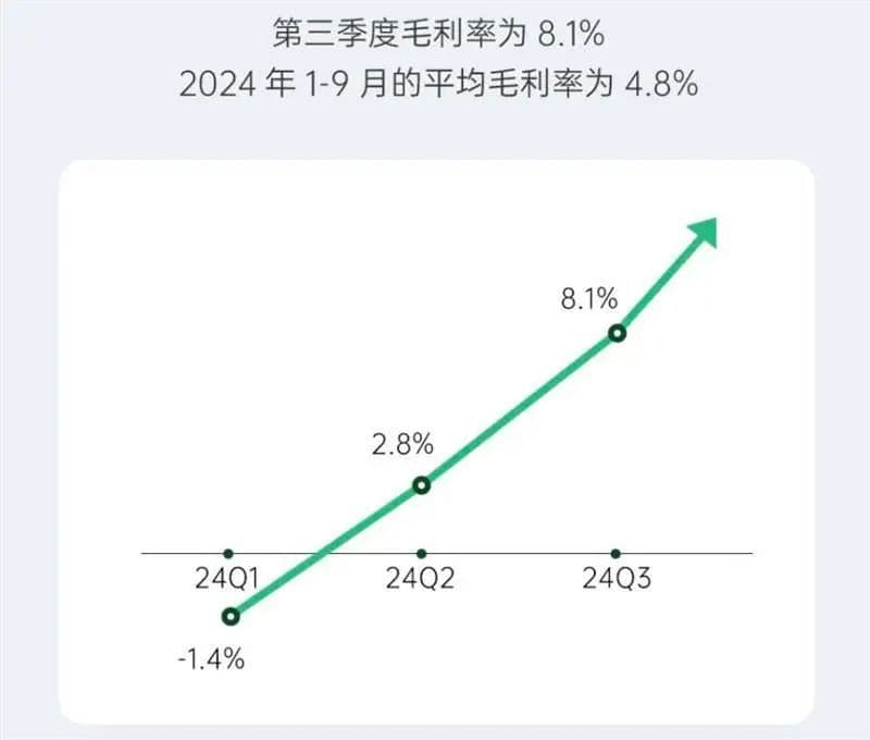 三季度,零跑汽车实现收益98.6亿元,较第二季度环比增长83.9%,与2023年同期相比增长74.3%,毛利率达到8.1%。经调整后净亏损为人民币5.4亿元,与上一季度相比有所减少。