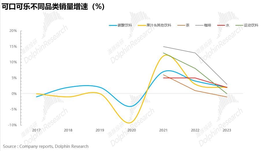 从可口可乐自身品类占比情况看,虽然近年来消费者健康意识觉醒导致碳酸饮料大品类增速有点“拖后腿”,但仍然贡献了可口可乐64%的销量,是公司妥妥的基石业务。在坚守碳酸主业的基础上,公司也及时抓住了非碳酸饮料快速增长的趋势,逐步向全品类软饮转型。从下图可以看出水,运动饮料,即饮咖啡近年来增速较高。