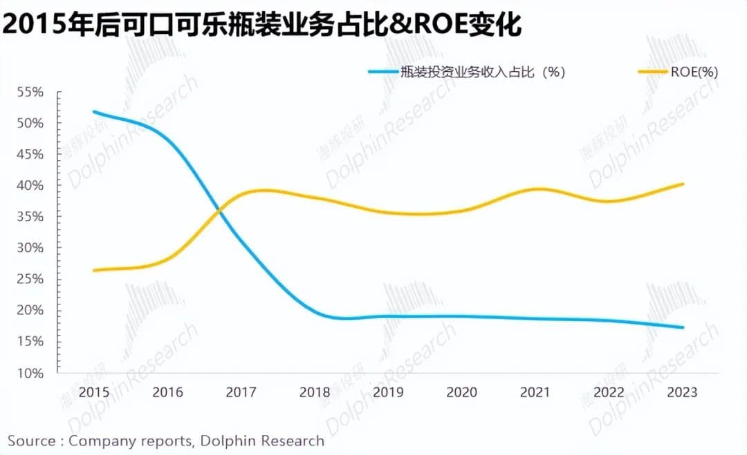 2006年可口可乐成立瓶装投资部门BIG(Bottling Investments Group)并继续收购表现不佳的瓶状厂并加以改造,确保其持续输出高质量产品。此阶段公司通过加强对瓶装厂的控制转为重资产运营模式,生产、销售流程得到优化,运营效率提升,但是大规模投资瓶装厂也带来个大问题——资本回报率大幅下滑,ROE 从原本的 40% 一路掉到 24% 左右。