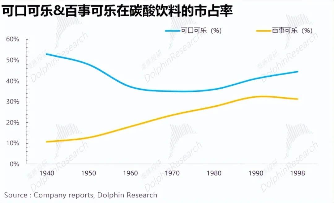再加上1960年代聚焦年轻人市场,打造年轻化品牌形象,百事更是吸粉无数,1940 - 1970 年这 30 年间,百事可乐市占率从 10.8% 一路飙升到 23.6%,可口可乐市占率则从 53% 一路下滑到 35%.