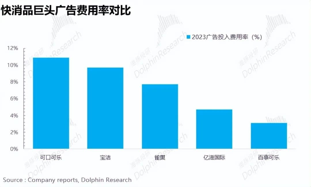 1)高举高打,重品牌,强营销。可口可乐打成立那天起,在营销上就没低调过,一直是高举高打。复盘近些年广告投入,除了 2020 年疫情突袭,不得已削减了广告投放,其余年份那都是“大手笔”,广告投入轻轻松松超 40 亿美元,广告费用率超 10%,跟百事可乐、其他快消品公司一比,简直就是 “财大气粗”。
