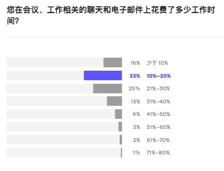 譬如,开会、沟通、文档整理等任务充斥在程序员的日常工作中。33% 的开发者透露,自己日常要花费 10%-20% 的时间在会议、工作相关的聊天和电子邮件上。
